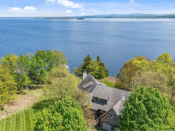 Perched on a breathtaking point of land with over 600 feet of direct lake frontage, this rare 3.25-acre property offers stunning panoramic views of Lake Champlain, the Green Mountains, Ball Island, & Burton Island. Designed by renowned architect Milford Cushman, this 3-bedroom, 3-bath custom home captures the essence of lakefront living with spectacular water views from nearly every room. At the heart of the home, you'll find an open-concept layout that seamlessly blends the kitchen, breakfast nook, dining area, & great room - leading out to a screened-in porch & slate garden patio perfect for entertaining. The kitchen is a chef's dream with custom cabinetry, granite countertops, & a double oven. The first-floor primary suite offers peaceful lake views, two walk-in closets, a luxurious bath with soaking tub & shower, & access to a private covered porch. A cozy den, laundry room, & mudroom complete the main level. Upstairs, there are two additional bedrooms, full bath, bonus room, & attic storage. Enjoy beautiful features throughout: cathedral ceilings, a fire-lit living room, expansive windows, & built-in shelving. The large unfinished basement provides ample storage space. The grounds are beautifully landscaped with mature trees, perennials, & ornamental shrubs. The shale beach offers easy access to swimming, kayaking, & boating, with a private dock and mooring included. Lovingly maintained this exceptional home is a true Vermont lakefront gem!