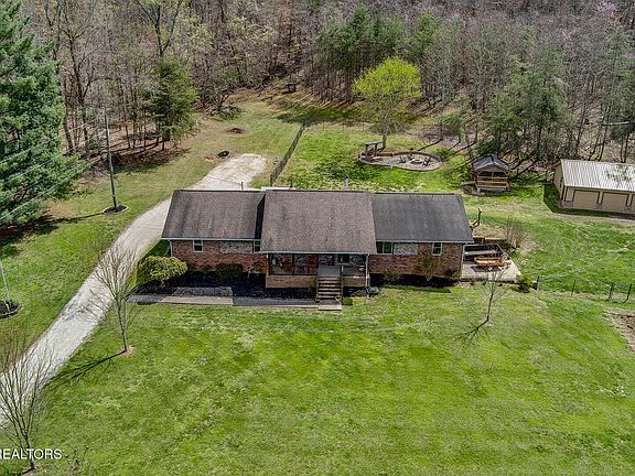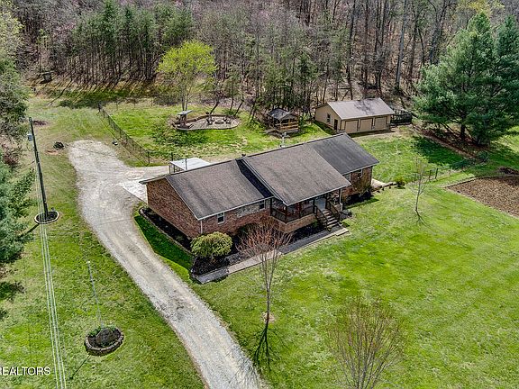 **Multiple Offers Received - Please submit highest and best by 7pm Sunday, 4/6/25 with response time of 9pm.*** Nestled at the end of a quiet road, just 30 minutes outside of Knoxville, this 4-bedroom, 2.5-bath mini-farm offers privacy, functionality, and the charm of self-sufficient living on 6 acres of partially wooded acreage and open pasture. Custom Built home boasts 2,272 sq ft on the main level with Birch hardwood floors throughout and tile in wet areas, split plan with oversized bedrooms, den/library with tons of storage. With an additional 1,760 sq ft semi-finished walk-out basement that features an auxiliary, commercial style kitchen, large rec room, overabundance of pantry storage, a workout area, and walkout to a private 22' x 30'' patio. This property provides ample space both inside and out. Designed for versatility, the home includes a rear-entry main-level garage and a detached 3-car garage, 36'x25', with individual bays. The property offers an abundance of self-sustaining features such as a wood-burning stove, well water w/filtration system, and a septic system. Cultivate your own food with an established vegetable garden, fruit-bearing apple and pear orchards, blackberry and raspberry vines, and chicken coops. Additional amenities include RV parking with electrical and septic hook-ups, a firepit with chairs, a charcoal BBQ, a large open-air wood shed with starter supply of firewood, and a fenced backyard. Enjoy the privacy of your own homestead while still being within reach of Norris Lake and other local conveniences. Appliances and equipment conveying with the property include the primary kitchen refrigerator, microwave, range/oven and dishwasher; in the auxiliary kitchen in basement - refrigerator, range/oven, one small cream freezer, and two custom built counters on casters with butcher block tops; two dehumidifiers, two sump pumps, and outdoor essentials such as the firepit chairs and BBQ grill. Seller offering 2-10 Warranty.