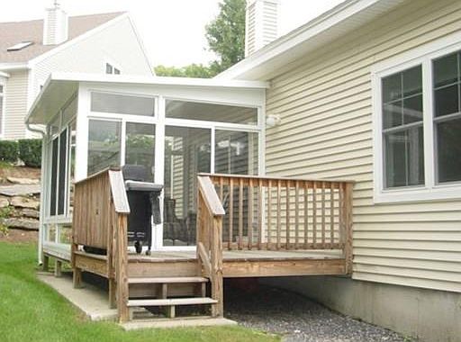 "The Seasons". Turn key end unit with hardwoods, gas fireplace, three season porch, deck, ss appliances, laundry off kitchen and more. Open, airy and bright.This exceptional unit has large living room/dining room combo with fpc. The first floor master suite has a walk-in closet and full bath off. On entry into this unit is an open den area private to the rest of the home.On the second floor is an open balcony area, large room could be used as an office and second bedroom with bath and walk-in closet. .Woods across from the unit gives you the feeling of semi-country living. Don't miss out.
