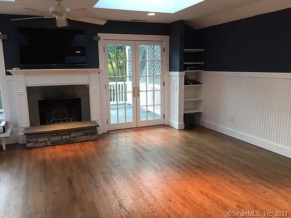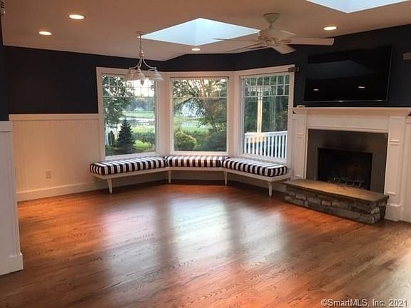 Located in one of Darien's sought-after neighborhoods, this four-bedroom ranch provides flexible living space in a beautiful setting with views of the Five Mile River inlet. Enjoy a charming living room with fireplace and built-ins, open kitchen/family room with fireplace, master bedroom with updated en suite bath and walk-in closet and two additional bedrooms on the main floor. The large finished lower level has water views and includes a fourth bedroom, full bath, and a large bonus room with kitchenette and electric fireplace and offers plenty of space for work or play. Relax on one of the 2 decks and 2 terraces and enjoy the lush property and views.