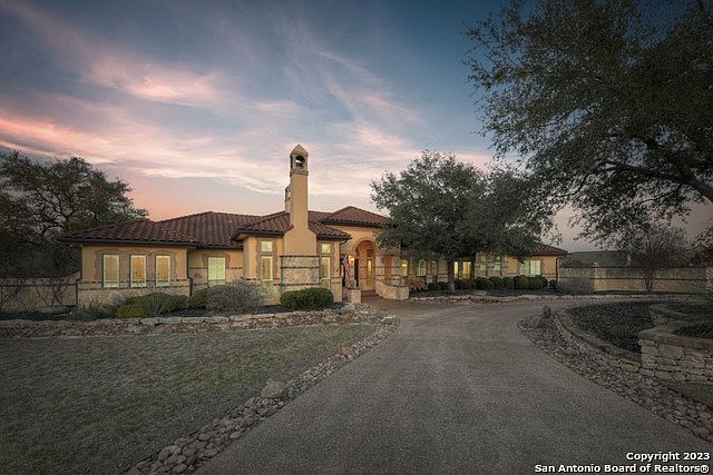 Step into this Mediterranean-style home and be greeted by elegance and sophistication. Situated in a gated community in Spring Branch, Texas, this home provides luxury in the Texas Hill Country. Adjacent to River Crossing Golf Club and just minutes away from the Guadalupe River. As homebuyers enter the house, they will be in awe of the attention to detail that went into building this residence. Exceptional craftsmanship can be found in features such as vaulted ceilings, an exquisite stone fireplace, beautiful tile work, customs shutters and crown molding throughout the home. Gourmet kitchen with high-end appliances, a large kitchen island, and stunning countertops will please any home chef. An entertainer's dream, there is ample space in the living room to gather with loved ones. The primary bedroom is the ultimate space to find relaxation and tranquility. The primary bedroom is fit for lavish living with a captivating dome ceiling, private balcony access, and a spa-like en suite bath. In the home, buyers will find a second living space with a wet bar and a second fireplace for cozying up with loved ones. Secondary primary suite has its own covered patio to enjoy the quite sunsets. Two additional bedrooms have ample space for owners to use as needed. Outdoors is a private oasis with a remarkable Keith Zars pool and spa, as well as ample open patio space. Elevated Texas Hill Country living can be found at this spectacular home. Schedule your private tour and see this space for yourself today!