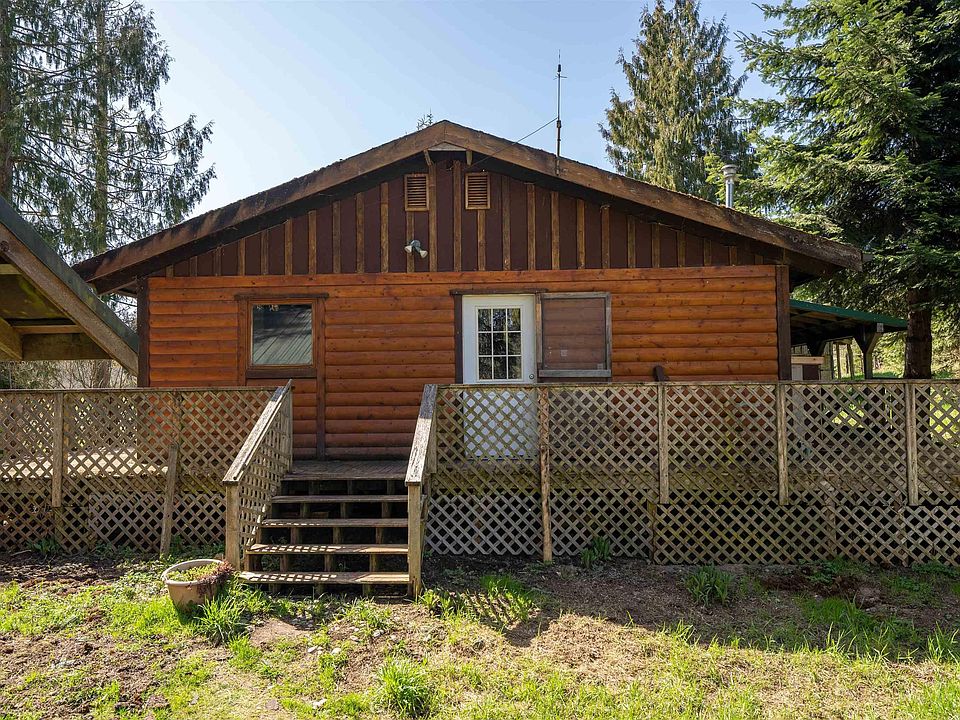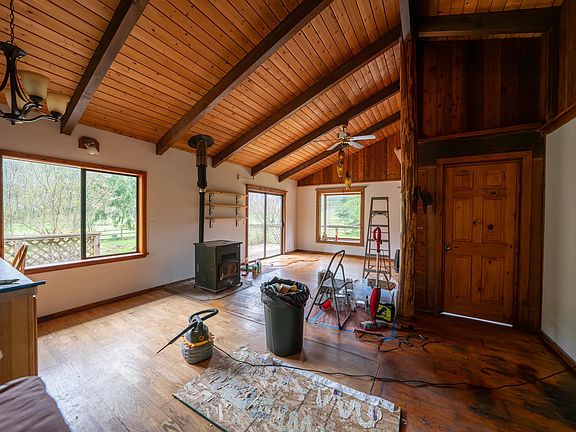 Two cute fixer upper cabins on 5+ acres. Main cabin features include high vaulted ceilings, pellet stove, full wrap around deck mountain, pond and creek views. Jimmy Come Lately Creek flows through. Very private yard, part pasture part treed, with a small pond and the creek. Room for horses or other livestock and pets. The second smaller studio/cabin boasts a covered deck, and wood stove for guests or projects. There is also a 40 ft. container previously utilized as shop Solar power and fruit trees.