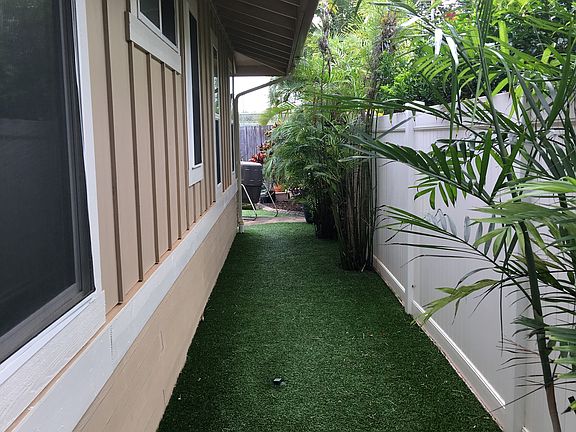 Pride in ownership shows in this one level sought after home, with 4 bedrooms and 2 baths. In a cul de sac with a nicely groomed long driveway with lots of parking, palm trees, putting green style no-mow lawn and auto drip irrigation for landscaping, as well as a French drain system surrounding the house. 15 ft vaulted ceilings, open concept living space with custom upgrades throughout. 18 panel photovoltaic owned system and central air conditioning. 1832 sf living area. You will love the privacy of this home with a fenced yard, West Maui Mountain views and quiet surroundings. A must see!