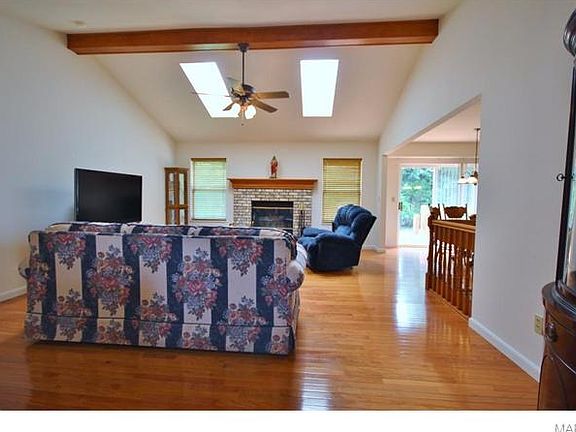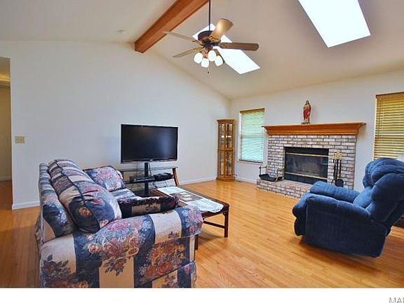 Don't miss out on this beautiful home in Wentzville Schools! As you walk to the front door, you'll notice the meticulously maintained landscaping. A bright, open living room welcomes you. With skylights, brick fireplace, and gleaming wood floors, it's perfect for entertaining. Beyond is the dining room and kitchen, also with wood floors, oak cabinets and plenty of counter space! The master suite is spacious and features a vaulted ceiling, marble surround tub and separate shower, and oversized vanity! Two more generous-sized bedrooms and a full bath complete the space. The basement is ready for your finishing touches with 9-foot concrete pour! Sliding glass doors in the dining room lead you to a newly refinished, enormous deck! Perfect for entertaining, the backyard leads to open ground and trees. Within walking distance to Dardenne Town Square shopping and just moments from highways, schools, and parks, this turn-key home is just waiting for its new owners!