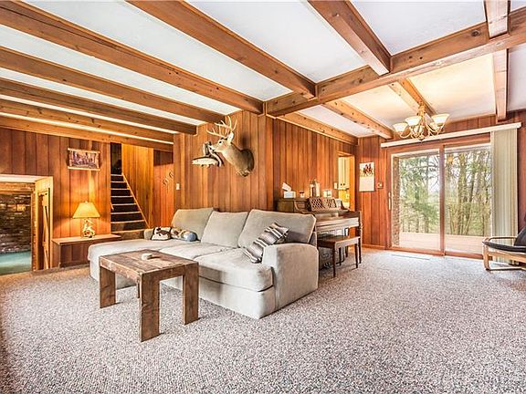 Welcome home to this one-of-a-kind retreat, perfect for a private retreat or entertaining! Meticulously maintained and move-in ready. Beautifully landscaped, this home boasts a large family room and spacious living room both with wood burning fireplaces and natural wood beams. Every room in this rustic retreat is graced with natural wood walls. The updated kitchen is perfect for making home cooked meals, and a full bathroom is conveniently located on the first floor. Upstairs you will find 3 spacious bedrooms with large closets, and a second full bathroom. Just off the kitchen and dining room is a patio and a large deck perfect for entertaining or just enjoying the private space with a wooded view and landscaped grounds. On the other side of the private drive is the three car garage and plenty of parking if you plan to entertain. An historic 1700's log cabin also graces the property. It also has a functional wood burning fireplace. This home is a nature lover's sanctuary!