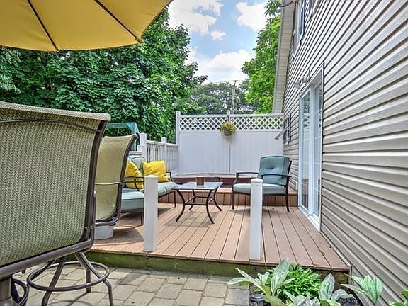 Beautifully updated and well maintained home with three bedrooms and two full bathrooms. First floor open floor plan with new kitchen featuring granite counter tops and beautiful cabinets, dishwasher, microwave, and garbage disposal. Sliders from kitchen lead to a private deck with a hot tub and a newly fenced in back yard. Three second floor bedrooms have hardwood floors. Master bedroom has a master bathroom with a shower. Roof and boiler approximately 4 years old. Hot water heater about 1 year old. Gas is available to the house. Private backyard with beautiful perennials. One car detached garage.