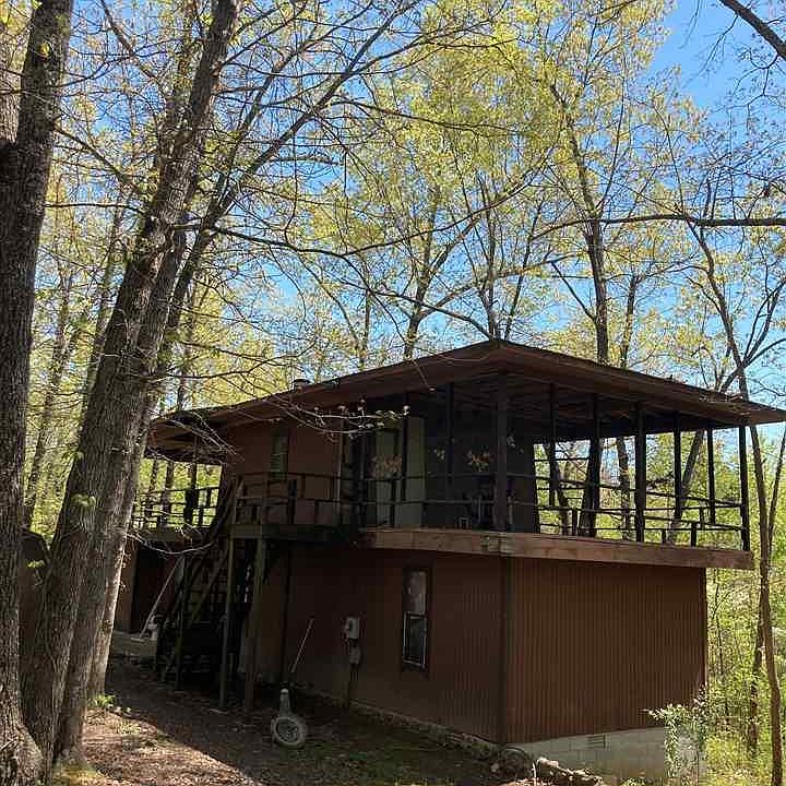 Shades of Frank Lloyd Wright Architecture describes this home. A fixer-upper nestled between Driftwood and Breckenridge subdivisions. 2 BR 1 1/2 BA, Freestanding fireplace, 2 upstairs covered porches overlooking wooded 1.25 acres m/l with a creek at the bottom of the hill located on a dead end paved road.
