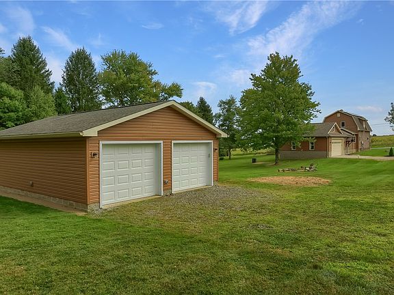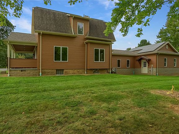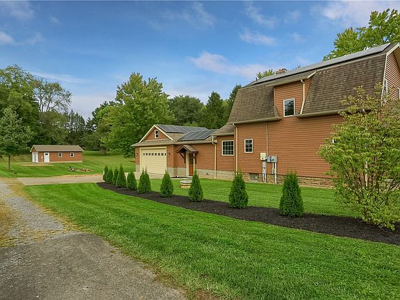 Min to Rtes Cranberry/68/8/422/528 this Country Home stands proud on a 2 acre flat lot perfect for gardening/animals/building or simply privacy. Renovated home features 2 beds/ 1.5 bath/ 4 car garage(s) wired for EV cars/high AMP use. Property is ELECTRIC + SOLAR. It's where "Farmhouse meets technology". Construction updates INCL: Roof, Windows/Doors, interior paint, carpet, feature lighting, HVAC/AC w heat pump, solar system. Original & new hardwoods live in harmony w the original pocket & hinged doors. Mud Room w heated floor is perfect for Home Office/expanded living use. HALF BATH. Kitchen w solid oak cabinetry, Corian, Farmhouse sink, Coffee CTR & Eat-In area. OPEN CONCEPT Living & Dining Rms don gorgeous Coffered ceiling, window bench & Surround A/V system. UP: Owner's Bedroom w/ LVP floor, circa 'barn door' XL closet. Bed2 w exposed chimney, new carpet & ceiling fan, XL closet. LL: Laundry CTR w/ sink, Pittsburgh toilet & shower, storage, HVAC, Water system & sump pump.