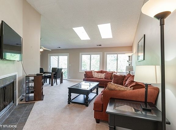 Highly sought after Hidden Lake Village! This adorable 2 bed/2 bath home features large living room with fireplace and lots of windows. Dining room with sliders to private balcony backing to gorgeous tree line. Beautiful kitchen boasts granite counter tops, maple cabinetry, stainless steel appliances and pantry closet. 2 large bedrooms and 2 full baths, including main bedroom suite with updated bath and walk in closet! In unit laundry with newer washer/dryer. NEW CARPET THROUGHOUT! 1 garage space. Fabulous community pool. Close to shopping, restaurants, transportation and more! Top rated District 102 and Stevenson High School!!