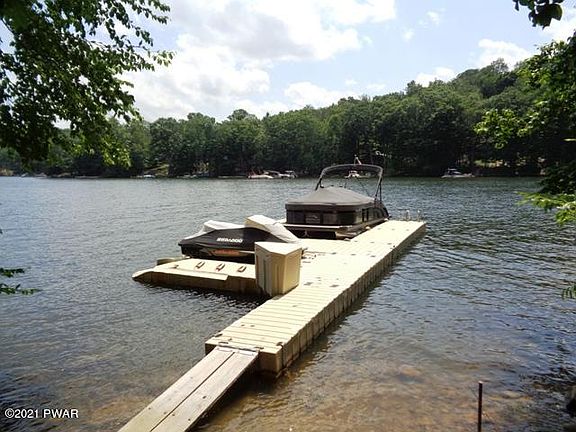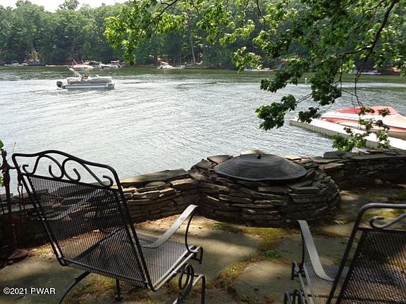 LAKEFRONT on Motor Boating Lake Wallenpaupack. Great views! Short distance and nearly level to water. Large newer dock. Rustic, restored, wood and stone Chalet . Stone patio w/ firepit at lakeside. Screened porch, side covered deck. 3 bedrooms, plus spacious loft w/extra sleeping areas, 2 full baths, floor to ceiling stone fireplace, hardwood floors, walkout lower level w/ family room/ in-law suite, and bluestone patio. Whole house generator. Double shed for golf cart or 4 wheelers. Great fishing right from your own dock! Commutable distance to NYC and Major Metro Areas.Turnkey, just bring your overnight bag!