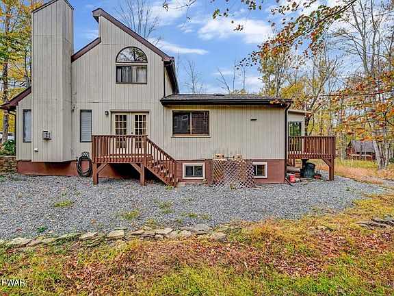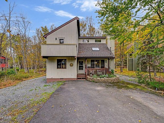 Located in The Hideout, a four-season amenity filled community in The Northern Poconos, just two hours from the NY, NJ and Philly Metro Areas. Nestled in the highly sought-after ''Golden Triangle'' on Oak Circle, this beautiful contemporary home offers peace and privacy with minimal thru traffic while providing easy access to major community amenities. New Roof, new gutters, new exterior balcony, new masonry! Step inside to a spacious kitchen featuring vaulted ceilings, abundant cabinet space, a walk-in pantry, laundry room, and half bath. From the kitchen, enjoy seamless access to the sunroom and rear deck, perfect for relaxation or entertaining. The living room boasts new carpet, a propane brick fireplace, built-in cabinets with a sink, and skylights that flood the space with natural light.The second level is entirely dedicated to the expansive primary bedroom, which features high ceilings, an en suite bathroom with a whirlpool tub, a portable sauna, and a loft area. The main level offers two additional bedrooms and a full bath. The partially finished lower level is ready for your personal touch, with completed sheetrock and the opportunity to choose your preferred flooring. This home combines comfort, style, and convenience in one of the best locations around! Easy water shut off on main level.