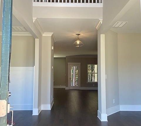 Georgetown at Oakleigh Pointe 6 bedrooms, 5 full baths, 2 car garage. Kitchen featuring 42 " white cabinets, quartz counter tops, Hardwood floors, breakfast area, custom backsplash,Stainless steel appliances, double ovens, gas cook top, up grad lighting. Large family room with a gas starter fireplace includes logs, Hardwoods,m extended Patio, Separate living room and dining room, Guess bedroom on the main. Large Owner Suite with a sitting room, owner bath with Tile bath, Mega shower, bench and rain shower head, gentleman Ht. Vanity, double sinks, walk in closet.2 secondary bedrooms share a bath, 1 other has its own full bath and walk in closet. The 3rd floor featuring game room, media room and the 6 th bedroom with a Full bath.