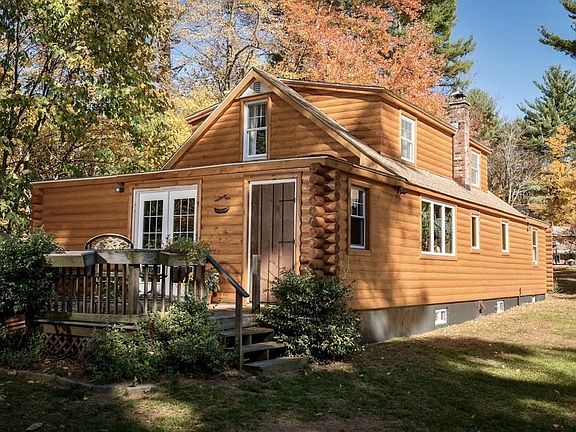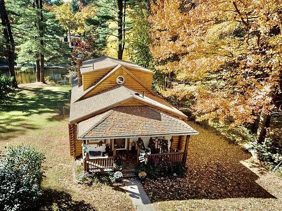 WATERFRONT. Vacation at home in this 3 Bedroom, 1.5 Bathroom, 1872 sq. ft., Cape Cod home located on a dead-end street on picturesque Alden Pond. The first level features a large eat-in kitchen, bedroom, full-bathroom, first-floor laundry, living room and sunroom with gas stove, stone accent wall & unique floor hatch to a full basement. French doors open to a composite deck with hot tub. A good-sized bedroom, Master bedroom, and a half bath complete the second level. The backyard features an additional storage shed, peach trees and blueberry bushes. Craftsmen will enjoy the detached 2-story garage/workshop with walkup loft. Its attached shed offers additional storage and changing room for pond-goers. Just steps away from a private beach and dock; swim, canoe, kayak & fish right in your own back yard. APO: Laminate flooring and carpet on first level (2019), Wood siding (2018), Hot water heater (2015), Roof (2009).