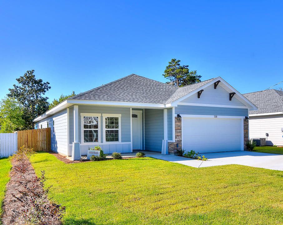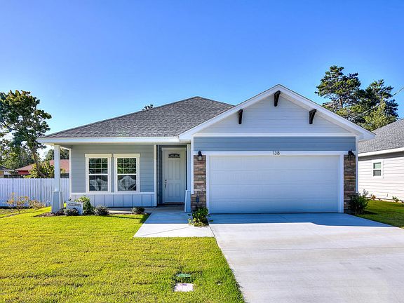 Beautiful new construction home. 1,785 Sq Ft of open floor plan living space with 3 BR's and 2.5 baths. Porcelain tile throughout for easy beach living. Custom Craftsman style, painted, shaker cabinets in kitchen and baths, granite counter tops and stainless steel appliances. The living room with trayed ceiling opens onto the covered patio and fenced back yard. Large master bedroom with luxurious tiled bath, double sink vanity, walk-in glass enclosed shower, soaking tub and huge walk-in closet. 2 additional guest bedrooms with Jack and Jill bath. This home checks off everything on the list with 9' ceilings, upgraded lighting, beautiful finishes, fully sodded yard with lush landscaping and 2 zone irrigation system and even hurricane fabric shutter.