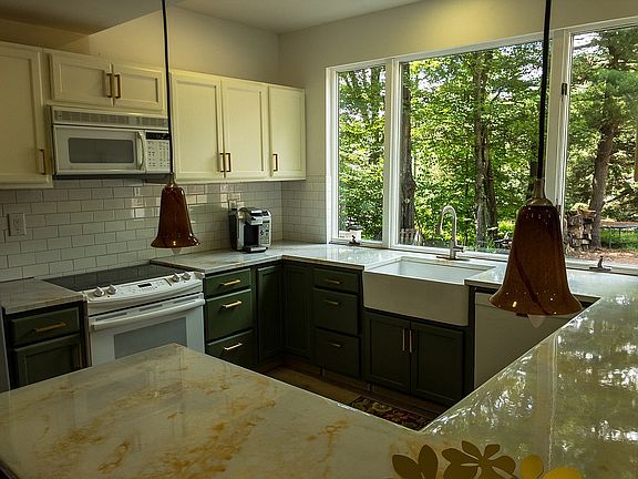 Beautiful custom European craftsman Ranch nestled in the tall pines with custom windows to allow nature and natural light in! short walk through the woods to the river features 3 bedrooms 1 bath , wood fireplace, mud room and den/office