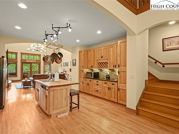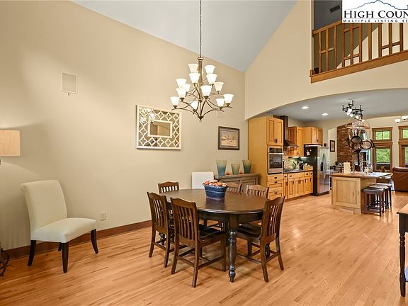 Discover mountain living at its finest in this luxurious Adirondack-style townhome, ideally situated between Boone and Blowing Rock. With over 4,400 square feet of meticulously designed living space, this home offers an exceptional blend of rustic charm and modern elegance. From the moment you enter, it's clear this isn’t your typical townhome. The main level welcomes you with warm oak flooring and ceramic tile, flowing through a spacious open-concept layout that includes a beautifully appointed kitchen, elegant dining area, inviting living room, and a half bath. The primary suite on this floor offers a peaceful retreat with a walk-in shower and direct access to the covered outdoor area.
