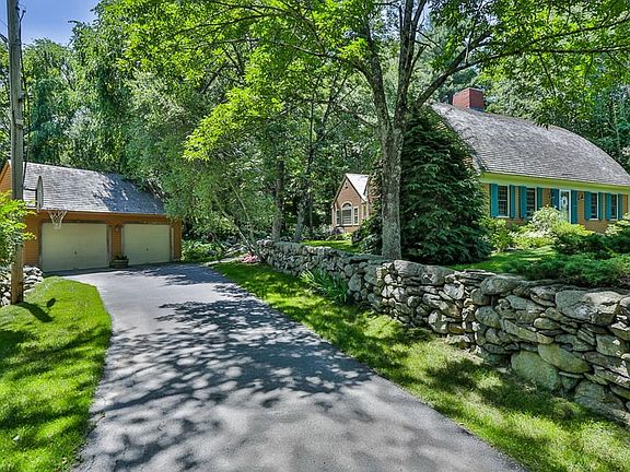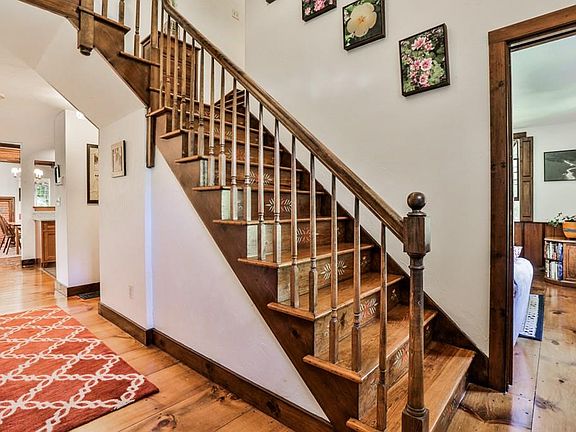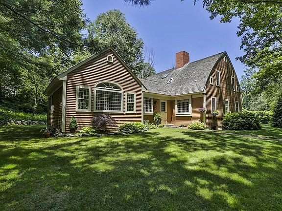 An architectural gem, featured in Early American Life magazine, is this charming reproduction Bow House that boasts quality workmanship. Exceptionally crafted with a large palladian window in light filled family room, Rumsford fireplace in living room, dining room with beamed ceiling and woodstove, country kitchen with cherry cabinets and walk-in pantry, first floor bedroom with attached full bath. Butterfly staircase to second floor with graciously sized master bedroom, remodeled bathrooms, and two separate bedrooms. Beautiful wide pine floors throughout, period hardware, and hand blown glass window panes. In addition, a partially finished basement for home office, media room, or craft space. This home is attractively set on 1.6 acres of land surrounded by stonewalls and beautiful, mature gardens.