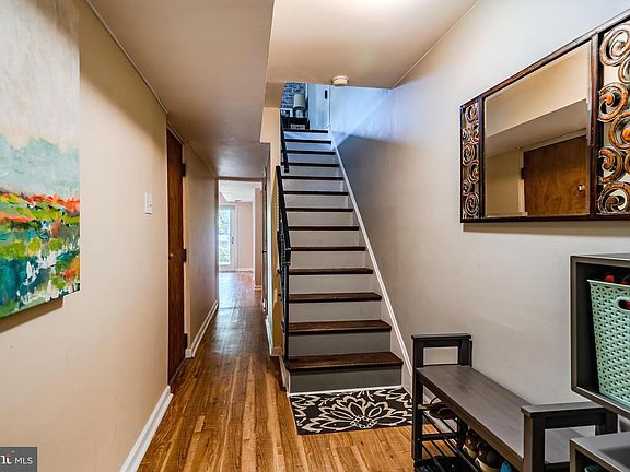 Huge 4 bedroom 2 bath End Unit Next To Open Space with a fenced yard and a Garage. Gas utilities, all brick exterior, Finished walk out basement with sliding doors to patio. 2 new patio doors. New dishwasher, new stove. Hardwood flooring on 2nd and 3rd floor. Carpet over wood floors on 3rd floor. Open concept. Living room with glass slider to deck. Kitchen with wood cabinets is open to the Breakfast room. Spacious dining room with buil in cabinets. Wood burning fireplace. Deck overlooks the fanced in backyard. Walk to Sutcliffe Park. Train to Center City. Home is Larger than it looks.