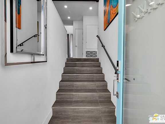 Live the Palm Springs resort lifestyle at this modern, newer-construction condo located just minutes from the Uptown Design District. This desirable south-facing upper-level residence offers tree-top views and sweeping mountain vistas to the south and west, creating a light-filled, elevated living experience. The thoughtfully designed open-concept floor plan features soaring 9-foot ceilings with exposed beams and floor-to-ceiling low-E windows that frame iconic Palm Springs scenery like works of art. The spacious kitchen is equipped with quartz countertops, stainless steel appliances, and designer pendant lighting, flowing seamlessly into the living and dining areas. Relax and enjoy the large private covered balcony with expansive views, an ideal space for outdoor lounging, entertaining, and taking in the surrounding scenery. Additional highlights include fully paid solar with a 10-panel, 2.9 kW system, a tankless water heater, stackable washer and dryer in-unit, and covered carport parking, along with ample guest spaces and community EV charging. Located within the gated 64@The Riv community, residents enjoy lush mature landscaping, a 60-foot resort-style pool and spa, fire features, covered seating areas, gas BBQs, and a gated dog park. The unit is ideally positioned within the complex away from busy streets and oriented to maximize privacy and mountain views. The home also features integrated, remote- and voice-controlled smart home technology, including smart lighting, motorized roller shades, a smart thermostat, alarm system, smart locks, and a doorbell camera for added convenience and security. Fee simple ownership, low HOA dues, and 30-day minimum rentals per community guidelines make this an exceptional opportunity for both full-time living and extended stays. Modern, stylish, energy-efficient, and priced to move, this beautifully appointed 2-bedroom, 2-bath condo offers 1,226 square feet of living space and was built in 2018, delivering outstanding value in one of Palm Springs' most desirable locations.