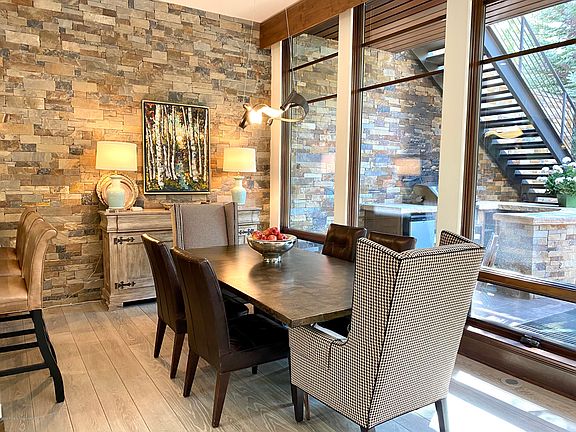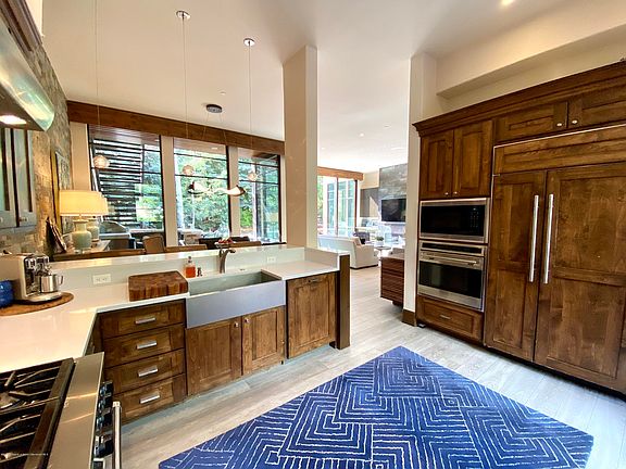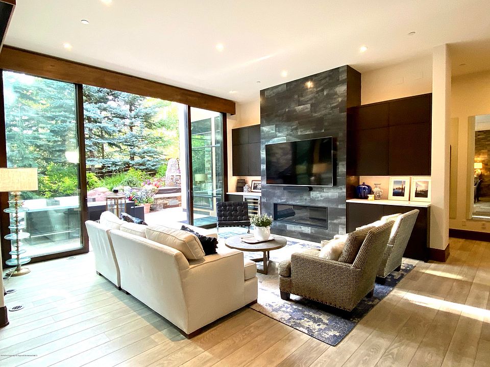 Modern 5-bedroom residence offering privacy and convenience. The main level living area includes a dining room, gourmet kitchen, and master bedroom with floor to ceiling windows and sliding glass doors. The living area opens to an outdoor entertaining space with mature landscaping, built-in grill, and hot tub. Dining room and gourmet kitchen boast designer light fixtures, Wolf appliances, and provide casual seating for up to 10, with a private patio off the kitchen. Master Suite offers a fireplace, sitting area, views of Aspen Mountain, his and hers vanities, jacuzzi tub, and walk-in closet. Lower level includes a family room with fireplace, bar, 3 bedrooms, and 3.5 bathrooms. The upper level hosts the fifth bedroom with a private deck.
