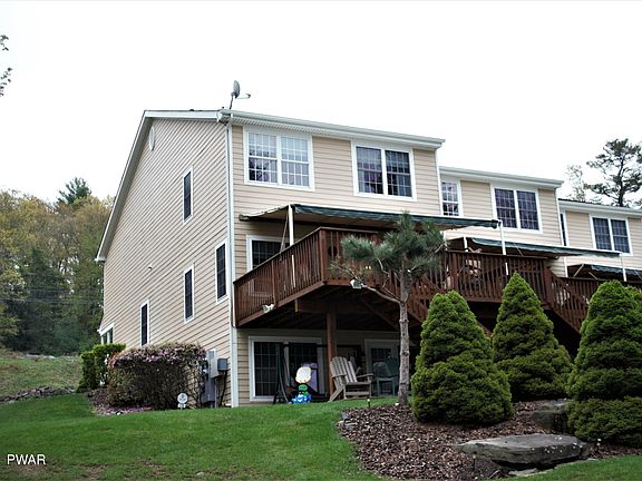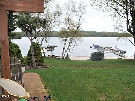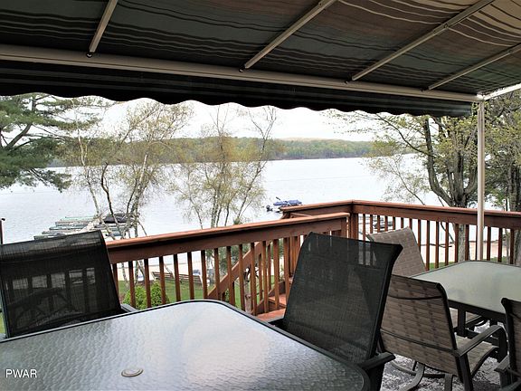 Meticulous lakefront corner unit town home with gorgeous Wallenpaupack views and a deeded boat slip just a gentle, short walk from your patio! Not many units become available in this quaint 20-family town-home community with such a short walk to the lake across a white sand beach to your own boat slip. Open floor plan main level with 3 BR and 3 1/2 Baths and a lower level walk out living finished living area with wet bar and Lennox gas stove. All floors provide views of the big lake. Retractable Sun-Setter awning on the main level deck with an additional lower level stamped concrete patio both overlooking the water, Single car garage converted a man-cave or what can be additional living space. see documents for additional home features. This unit is fully ready for a quick move in!