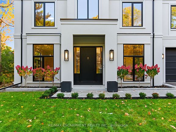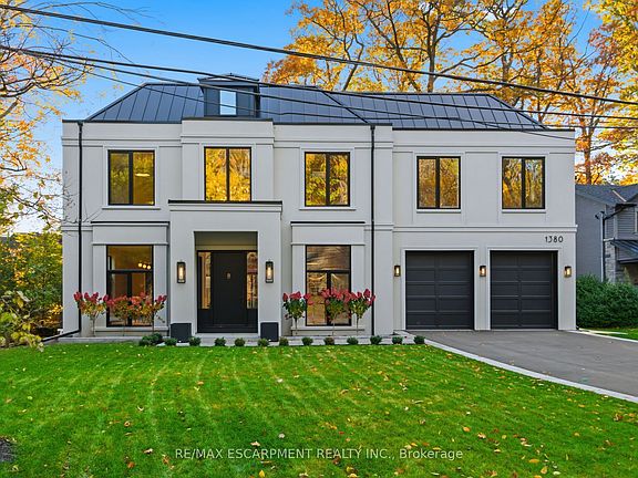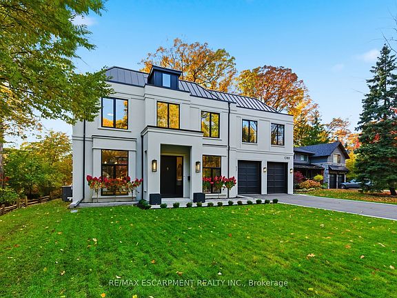 An exceptional custom-built estate by Montbeck Homes, this stunning Modern Georgian masterpiece offers over 7,500 sq. ft. of refined living in the heart of Mineola West, just 400 meters from Kenollie Public School. Set on a quiet, private lot, the home blends timeless elegance with cutting-edge design. The striking stone façade, black-framed windows, and metal roof with dormer accents exude curb appeal, while manicured gardens and an 8-car driveway complete the impressive exterior. Inside, a 26-ft grand foyer with a showstopping chandelier introduces soaring ceilings, herringbone white oak floors, and sleek Italian quartz tile throughout. The chef's kitchen is a showpiece, with a waterfall island, premium appliances, and custom cabinetry, opening to a skylit covered porch with a gas fireplace and outdoor kitchen rough-in-perfect for year-round entertaining. The two-storey great room stuns with a 26-ft feature wall, modern fireplace, and 42-bulb chandelier. Upstairs, the primary suite offers a private terrace, a custom walk-in, and a spa-worthy ensuite with heated floors. Each additional bedroom features bespoke detailing and designer finishes. Every bathroom has heated floors. The lower level with heated floors, walkout, and bath/bar rough-ins offers endless possibilities - home theatre, gym, or in-law suite. With dual furnaces, EV charging, smart home readiness, and professional landscaping, this home defines luxury living just minutes from Port Credit Village, top schools, marinas, parks, and the QEW. Experience the art of living-refined, inspired, and absolutely unforgettable.