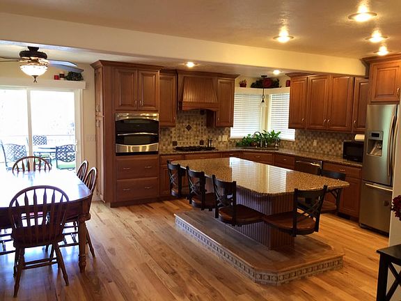 Updated kitchen with quartz counter-tops, custom tile backsplash, hardwood floors, gas range, double wall oven, corner sink, touch technology faucet, soft close hinges on drawers and cupboard doors, double pullout cupboard garbages, broom & mop/cleaning cupboard, toe kick dustpan vacuum, pull out pantry, recessed refrigerator space, and suspended seating on the large island; master suite with walk in closet, counter high double sinks in the master bath, separate toilet room, and walk in double headed shower; huge storage room with outlets, water faucet and drain for easy rotation of water storage; large covered deck with spiral staircase, rolling shades, lights & fan; covered patio with lights, bike/outdoor toy storage closet, hammock hooks, and plumbed for an outdoor drinking fountain; private courtyard patio; multiple raised gardens with secondary water, drip & sprinkler system & timers; cement curbed, mature landscaping & flowerbeds with 5 fruit trees (2 peach, 2 pear, 1 apple), and raspberries; backyard follows a creek with natural landscaping; large custom garden/yard shed with lights and electrical power; 3 car garage with one extra deep; workbench & lots of cupboards, built in shelves and cubicles in the painted garage; mudroom with cubbies, bench, hooks and leaded glass transom window for natural light; gas fireplace in basement family room with electronic thermostat; upstairs laundry room with in-wall ironing board; once a year heater filter; water softener; A/C; reverse osmosis drinking water system; basketball standard; 2 ‘secret’ storage cupboards (one locking) in master bedroom perfect for gun or gift storage; wrought iron railing on porch and decks; roofing replace in Oct. 2003; all house windows replaced and updated to vinyl double panes in 2004; addition and remodel done in 2010 which included additional new roofing, gutters (covered for leaves & debris in the back) & insulation.