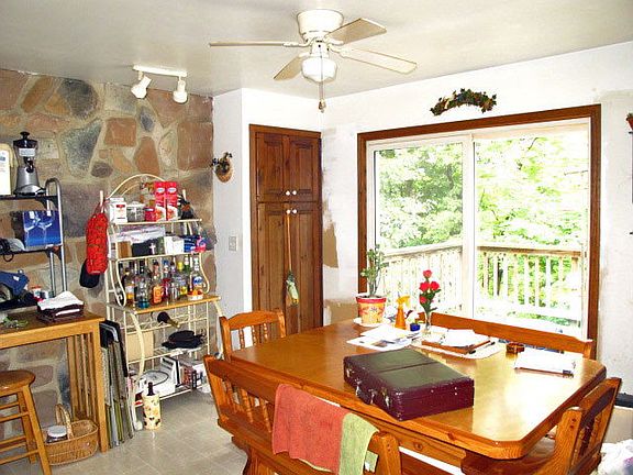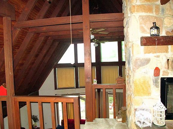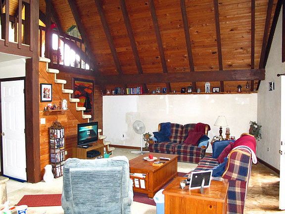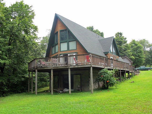 Secluded beautiful setting for the lovely Chalet on 6.5 acres. . Chalet sports 2 vaulted ceiling, stone fireplace on first and second level. Loft has two dormers providing lots of light. Master suite has private deck. Massive front desk. Basement is unfinished but has front section is set up to be finished with walk out sliders and fireplace. Located very near to Shy Beaver boat launch. Easy drive to the turnpike. Owner states deer, turkey and bear all seen on the property. Siding is log veneer.