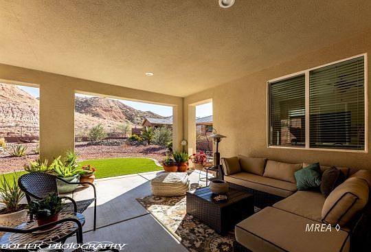 This gorgeous new home is located in St. Andrews, a single family community north of I-15 surrounded by the Canyons Golf Course. The home is situated on a spacious home site and backs up to an attractive desert bluff creating a wide open feel. The yard is surrounded by a privacy wall and the landscaping is gorgeous and low maintenance. The extended covered patio and eastern orientation are ideal for year round use of the outdoors. The interior of the home is stunning with a fun, modern flair and impressive features. The open concept floor plan is a favorite and the rooms are on opposite sides of the home including a large den/office w/ double doors and half bath. Plank tile floors run through most areas and the paint tones are warm. The kitchen is striking with linen colored cabinetry, granite tops and stainless appliances. The island is roomy and perfect for entertaining. You will love the master bathroom. The tile lined walk-in shower is roomy & the double vanity is long with a granite top. The closet is organized to maximize every inch of space with $1,800 custom shelving. Other features include laundry room & garage cabinets, costly fans, lighting and brand new water softener.