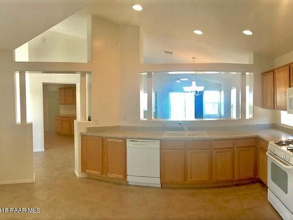 Exterior freshly painted, Popular ''Woodlands' 2 Bdrm + Den + 2 Baths, Gated Cottages neighborhood of Prescott Lakes. Bright & airy versatile plan provides flexibility in living spaces to match your lifestyle. Welcoming entry w/security screen door, tile in Entry, Kitchen, Dining, Hall & Baths, Wood slat blinds, Gas fireplace w/mantel, hearth & blower, 2 bay windows, neutral interior decor, extra storage. Enjoy relaxing [pretty much yr-round] on cov'd + open extended paver patio in easy-care garden setting w/ mature plantings & PANORAMIC VIEWS of Granite Mountain, San Francisco Peaks, Granite Dells & Surrounding Mountains. Extra pavers will convey to build a fire pit, BBQ area OR ? Ideal for Lock n' Leave or Full-Time living. Fantastic amenities + pvt golf + close to Downtown