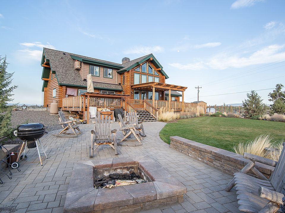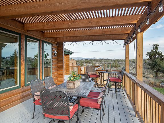 Stunning custom log home situated on over 3 acres with full mountain views with newly installed asphalt driveway. This property offers an unique opportunity with Dual Living. Main house is impressive with the 2 story rock gas fireplace, gourmet kitchen with walk-in pantry, master on main, large tiled shower & separate soaking tub. Upstairs the bedrooms connect to a full bath. The 2nd dwelling is fully furnished with kitchen, living room, 2 sleeping quarters, and full bath. 4-car garage, shop area, plus an extra large carport, perfect for a boat or toys. Outdoors is ideal for entertaining with a massive deck, hot tub, BBQ area, fully landscaped with water feature and fire pit too. This would make a wonderful full or part-time residence - only minutes to the Redmond Airport!
