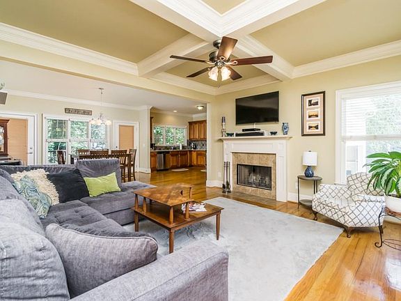This Move-In Ready, Beautifully Decorated, Craftsman-style home is waiting for YOU! Updated kitchen features Stainless Steel appliances and gleaming granite countertops. Hardwood floors throughout main level. The living room boasts coffered ceilings and a cozy fireplace which makes this room the perfect place to relax with family and friends. Fully fenced yard with private backyard and nice sized deck that has access through doors in dining area. Charming front porch will be your new favorite spot to enjoy a morning cup of coffee or evening drink! 2 Bedrooms on the main level could be used as office space, separate living room, etc., and share a full bathroom. Additional half bath on main level. 3rd Bedroom upstairs has hardwood floors, ensuite bathroom, and lots of natural light. Owner's Suite upstairs is very spacious with lots of storage and a gorgeous ensuite bathroom! Look no further! Two car garage and quiet street with no thru traffic. This one will go FAST.... so come see it TODAY!