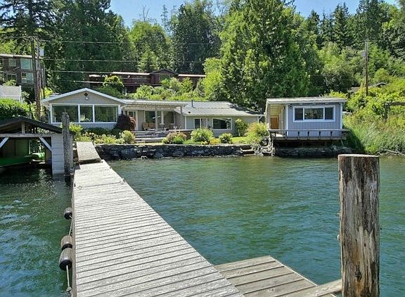 Single-level 1,500 sq. ft. main house w/2 bedrooms and 2 baths. Separate 225 sq. ft. guest quarters with bedroom & 3/4 bath. Dock & boathouse. Hot tub. 2-car garage.