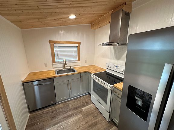 Imported Italian tile entry, new bathroom tile, new luxury vinyl floors throughout, ceiling fans in each bedroom and living room with new modern LED lights and fixtures throughout the whole property. Completely new kitchen with butcher block counters and real tongue and groove bead detailed pine wood ceilings, full size appliances, side by side refrigerator with water and ice, stainless steel dishwasher, deep sink, with plenty of storage, cabinet and shelving space and washer dryer hookups.