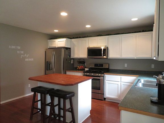 Nice four bedroom (inc master suite), 2 bath up and great room living down. Kitchen with island. Nice updates. Laundry upstairs and guest half bath down. New click it laminate floors and freshly painted inside. Large lefel fenced yard, backs to wooded open space behind. Raised garden beds. Underground sprinklers front and back. Near kids park and trails/ open space for hiking/walking dog. 8 min to town and base, yet woodsy feeling neighborhood. Won't last long.