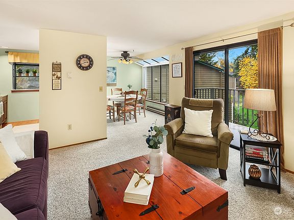 This spacious, top floor, end unit features two large bedrooms and 1.75 baths. Large windows, slider and deck face south for lots of light and views over Swan Lake. Enjoy your privacy in this quiet complex with only 4 units per building. Well maintained with updated kitchen, fiber internet, wood burning fireplace, full-size washer and dryer in unit, storage off the deck, assigned covered parking and tons of extra guest parking. Located in a fantastic, central location with easy access to Microsoft, Bridle Trails, Grass Lawn Park, Redmond, Kirkland and 405. No rental-cap, pet friendly, and it's pre-inspected.