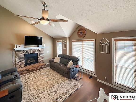 This beautiful FOUR bed, 3-bath home in Clearwater Falls is a must-see! Inside be greeted by gorgeous new flooring throughout the entry, stairs, living room, & kitchen. The living room is the perfect place to relax, featuring a stone gas fireplace & new Champion windows that fill the space with natural light. The eat-in kitchen is a dream, with SS appliances, soft-close cabinets, & plenty of counter space for meal prep & entertaining. Bedrooms are spacious with generous closets. Downstairs is the cozy finished basement, complete with an additional bathroom. The sliding doors lead to the deck & patio with no rear neighbors creating a private retreat for entertaining. The large, fenced backyard is such a peaceful setting to enjoy every season with beautiful flowering trees & newly planted peach trees. With a new roof & gutters & a one-year Choice Home Warranty included, this home offers peace of mind. Easy access to Offutt AFB, shopping, walking trails, & parks.