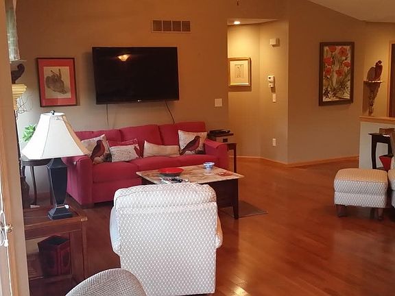This is a Robl built patio home which has three bedrooms and three full baths. Hardwood floors throughout the living room, dining room, and kitchen. Kitchen has granite counter tops, pantry, reverse osmosis and a water filtration system that are a few of the upgrades to this home. The home has a new composite roof, along with additional can lights, re-tiled entry way floor, and handrail added to the front porch entrance. Vaulted ceilings, gas fireplace, neutral color throughout the home. Cabinets in master bath remain with the home. Basement has a fully finished family/rec room, one bedroom, one full bath, and plenty of room for storage. The yard is abundant with trees allowing you to sit and relax on the deck and watch the birds come and go. Amenities include a community pool, stocked fishing lake, playground, greenbelt area and walking paths. HOA dues cover - lawn mowing/fertilization, sprinkler system maintenance, snow removal, and trash service. Specials have been paid off. Home had a new roof in May 2015