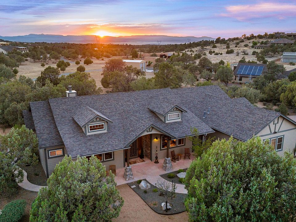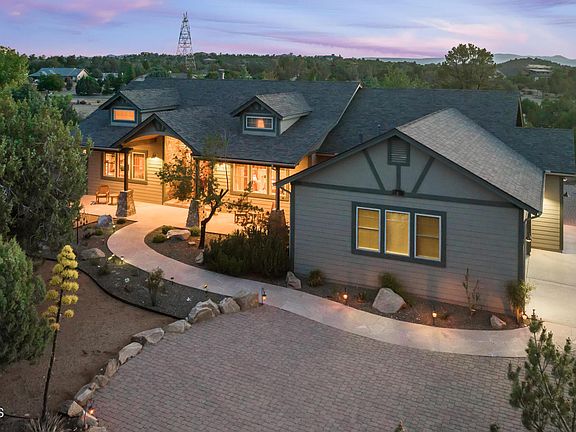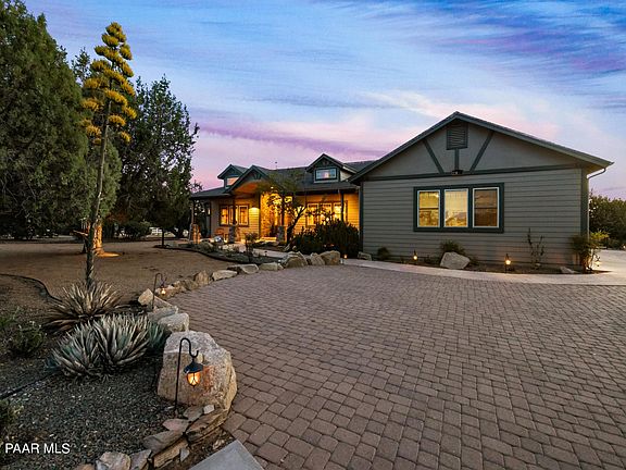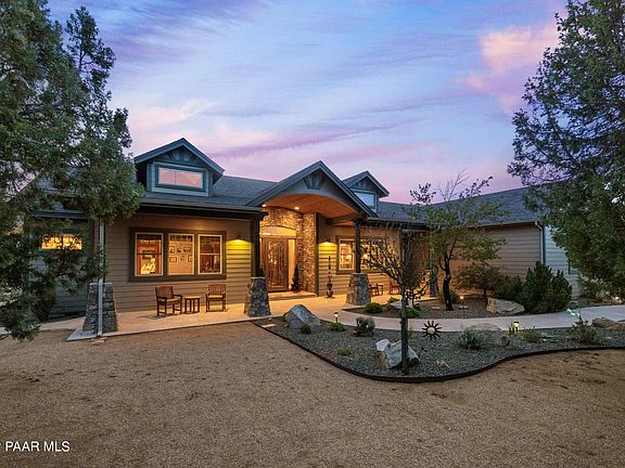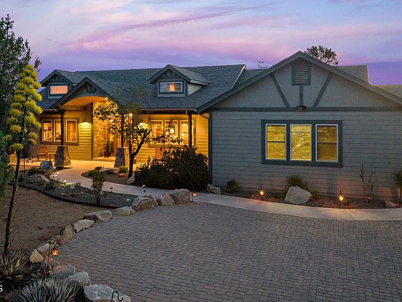 This spacious & stunning single level home on a premium corner lot offers panoramic mountain views of Granite Mountain & surrounding vistas. Outstanding curb appeal is accented by the circular driveway, oversized three car garage & meandering flagstone pathways about the grounds. Property is flat/level, usable horse property with beautiful mature landscaping in both front and back yards accented with landscape lighting for the perfect nighttime ambiance. Low maintenance exterior hardy board siding, tongue and groove under patios and entry archway with a stately grand entry, stone around the columns and front door, this home has been meticulously cared for and maintained by a single owner. Upon entry, CONTINUE... there is a grand foyer that opens into a beautiful great room with high ceilings, extensive hardwood flooring, stain-grade doors, base & trim throughout the home. There is a floor to ceiling stacked stone corner fireplace with wood or gas burning capabilities, access to the rear covered deck and patio. The large gourmet kitchen features an island as well as peninsula with decorative pendant lighting, great for entertaining. Gleaming granite countertops, extend from the counter to the base of the cabinetry, pull-out drawers, abundant storage & decorative glass cabinet fronts for display purposes. Stainless steel appliances including trash compactor, 5 burner Jenn Air cooktop with custom hood above and double Jenn Air wall ovens, adjacent formal dining room has vaulted ceiling that leads to a functional dormer window above for added natural light. Owner's suite is spacious, with indirect lighting and dedicated private access to the extensive rear back covered deck and patio below. Owner's bath has an oversized jetted tub, dual raised height vanity with travertine counters and powder area. Large walk-in shower with beautiful floor to ceiling tile, dual shower heads, private water closet and expansive walk-in closet. The guest wing of the home offers an additional junior suite with functional dormer window, expansive closet, attached private bathroom with raised height vanity, comfort height toilet and floor-to-ceiling beautifully tiled walk-in shower. Spacious third bedroom that is currently being used as an office, overlooks the rear patio and entertaining area, and has dedicated interior access to the guest bath which offers raised height vanity, comfort height toilet and full bath allowing. Spacious laundry room with upper and lower cabinetry, tile floors, utility sink, washer/dryer that convey with the sale. Oversized three car garage contains safe that conveys with sale. Trex covered deck off the great room is wired for sound and has retractable sun shades. Down a couple of short steps you will find an expansive paver patio, parklike setting enclosed with courtyard wall and built-in permanent BBQ complete with searing burners, sink, and a beautiful woodburning fireplace with extensive seating. The setting is quite stunning and is accented with beautiful rose bushes and mature trees for outstanding shade. Additional Features: Front entry security door, every room in the house is accented by a transom window above the doors, custom window treatments throughout the home. Open flagstone patios, horseshoe pits and drip irrigation. New HVAC in 2018, New roof in 2021, New Hot Water Heater in 2016, 2019 Washer and Dryer, Sewer/Septic Floater replaced in 2022, Exterior paint 2018 and Refrigerator was replaced in 2017.