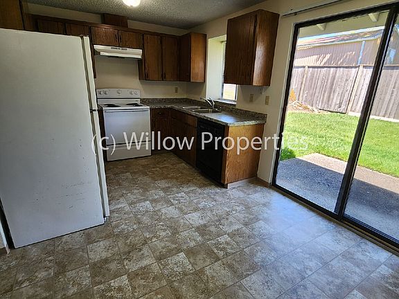 Spacious 2-bedroom duplex with a 1-car garage. Features a large living room with a cozy fireplace, dining area with sliding door to the backyard, and a master bedroom with an attached half bath. Includes additional off-street parking. Water, sewer, and landscaping services are included in the rent.