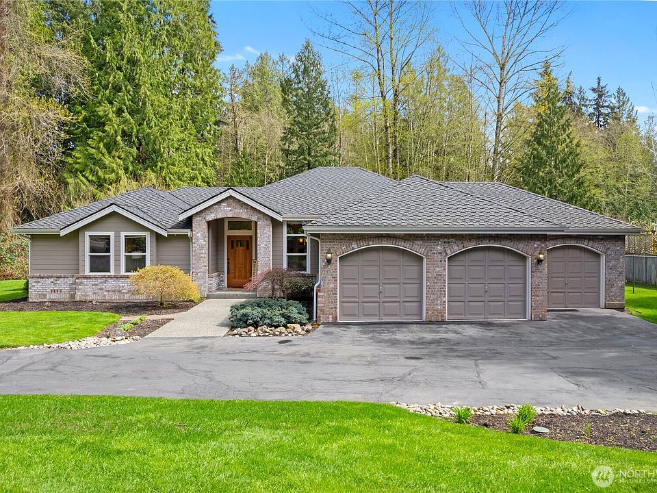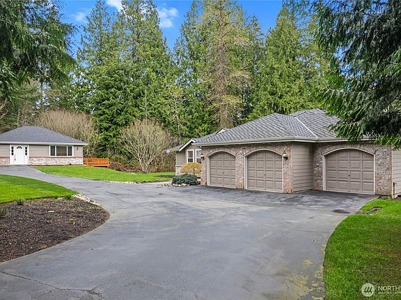 Tucked away on a peaceful dead-end street, this custom-built rambler offers a perfect mix of privacy & convenience, minutes from Mill Creek Town Center with easy access to I-5. Set on 4 serene acres, the property offers wooded trails and backs to protected green space with no future development. The thoughtfully designed main home includes 3 bedrooms + 2.5 baths, with warm, open living spaces that blend comfort and function. New water heater & A/C replaced in 2023 + 50 year 2018 Presidential roof. Steps away, a separate 700 sqft. cottage offers endless flexibility—ideal for multi-generational living, a guest suite, or flex space. A rare opportunity to enjoy peaceful, Northwest living without sacrificing access to all the amenities you need!