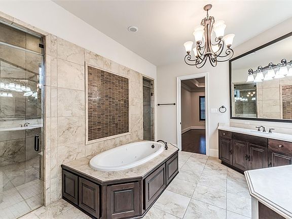 Your luxurious estate home awaits at 13803 Nathan Ridge Ln in the prestigious neighborhood of Rock Creek. Youll be welcomed with warmth and designer details beginning at the front door. Upon entry, youll notice rich floors that compliment the intricate woodwork in the soaring two-story foyer. Wrought iron spindles sweep up the spiral staircase and frame the Juliet balcony off the study. This is an entertainer's dream home with a wine bar in the formal dining room and a butler's pantry that leads to the kitchen equipped with all Jenn-Aire appliances and a massive island! So much of this executive home is downstairs including a palatial master retreat, large living room, beautiful family room with wood beam cathedral ceiling, media room behind massive barn doors, and one secondary bedroom with adjacent full bath. The full outdoor kitchen has everything you need for any gathering including a fireplace. You will love the sparkling Grecian pool and hot tub that completes your dream home!