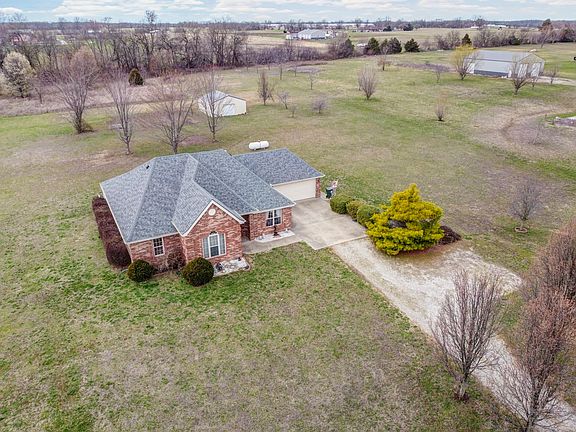 Nice home with 1789 square feet of living area just minutes from Mt Vernon and I-44 and 1/2 way between Joplin and Springfield. Home sits on 3.68 Acres and has a barn/shop for extra storage. All rooms are nice size Kitchen has lots of counter space, pantry breakfast bar and nook for eat in dining. There is also a formal dining room that could be used as an office or den. Primary suite has large bathroom with walk-in shower, great walk-in closet and 2nd closet too. Home sets back from street and dive is tree lined. Covered back patio to extend your living space. Home was build so there would not be stairs at any of the exterior doors for easier access into the home. Garage is over sized with cabinets for extra storage.