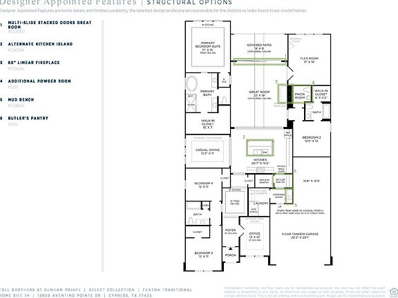 The Fenton Traditional home is single-story living at its finest. This impressive home features a covered front entry that opens into a foyer flanked by a spacious home office embellished with French doors for added privacy. Two generous bedrooms with spacious closets and a shared hall bath provide space and privacy away from the main living area. The well-appointed kitchen boasts a center island and tons of cabinet space. The casual dining room is graced with a tray ceiling and makes the perfect place for gathering while entertaining. A gorgeous cathedral ceiling and linear fireplace in the great room create ambiance for any occasion. A luxurious primary bedroom suite with tray ceiling includes a luxe bath with dual vanities, a separate tub and shower, and a generous walk-in closet. Added highlights include a flex room, a guest suite with a full bath, and a covered patio. Disclaimer: Photos are images only and should not be relied upon to confirm applicable features.
