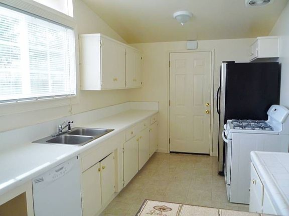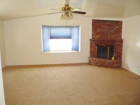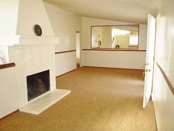 Single-story home with new neutral tan/brown tweed carpet, some dual pane windows, updated bath, extra-large family room (approx. 20x20) with bay window, two fireplaces, one in family room and one in living room, spacious bedroom, large covered patio and fenced yard. Kitchen has all appliances including refrigerator, gas range/oven and dishwasher and white cabinetry. Full size washer and dryer in family room closet as well. Two car garage entry is next to front door. Pets allowed two maximum under 20 lbs.