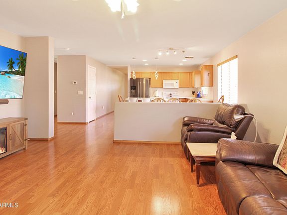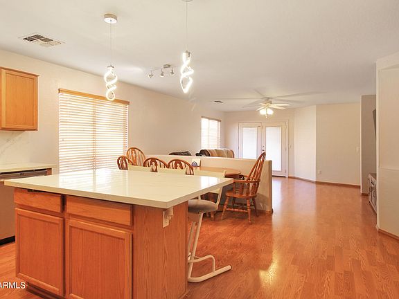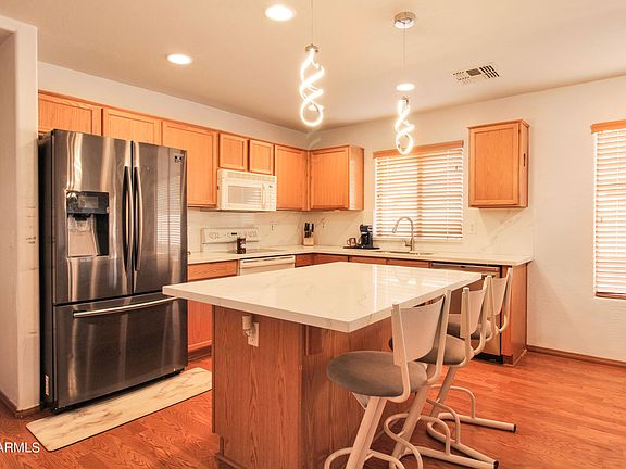 Experience the ultimate in modern living! This home boasts brand new AC, water heater, and solar, with no payments and reduced APS bills. The open layout kitchen, dining, and living area is perfect for entertaining. Enjoy marble countertops, matching backsplash, and a sleek island. Natural light fills the home through expansive windows. The primary bedroom offers a spacious retreat with a glass walk-in shower and oval tub. Step into the backyard with bright green turf, desert plants, and a covered patio with a ceiling fan. Embrace a lifestyle of comfort, function, and energy efficiency.