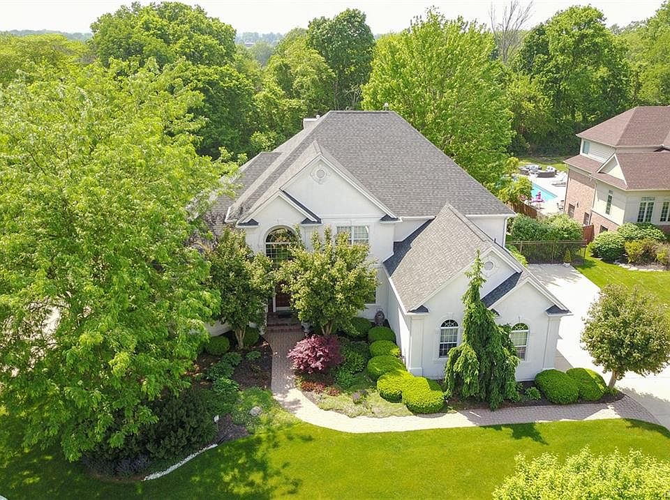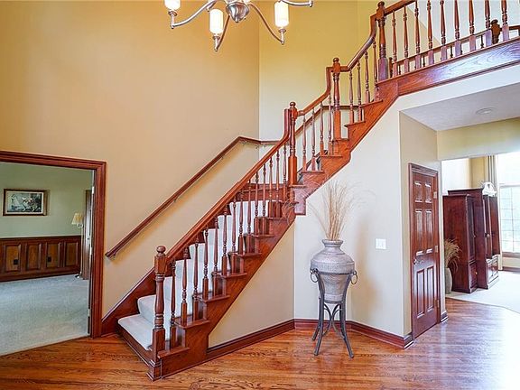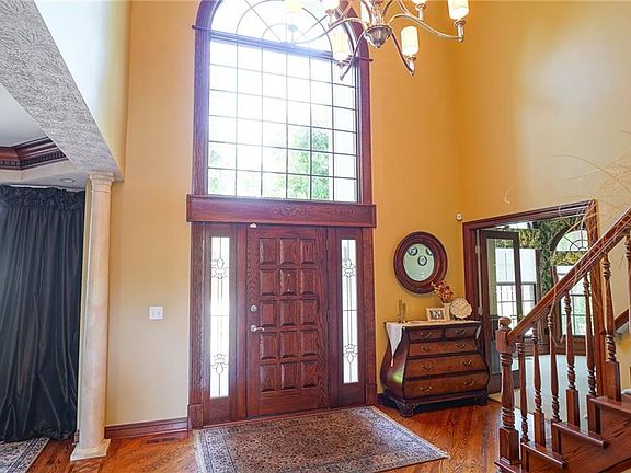 This French architectural style home is a dream come true with all the luxurious amenities. The kitchen is the heart of this home with Amish self-closing cabinets, butler pantry with 2 built-in refrigerator drawers, granite counters, gas stove, double ovens, drawer microwave, built-in bread drawer and walk-in pantry. The dramatic 2-story foyer showcases hardwood and inlaid floors with cherry-hued woodwork. Great room has gas fireplace and remote-controlled blinds. Music speakers are throughout the 1st floor. 1st floor Master suite features heated floors, rain shower head sprays, and hot water power boost. Entertaining is a breeze in the lower level with family room, game room and bar with sink and refrigerator, plus a full bathroom. Can lights have LED bulbs - never need replacing. The outdoor living space offers a 2-tier deck w/bar area with built-in frig, grill and TV and a fire pit table area. The salt-water pool with waterfall feature will keep you cool all summer long.