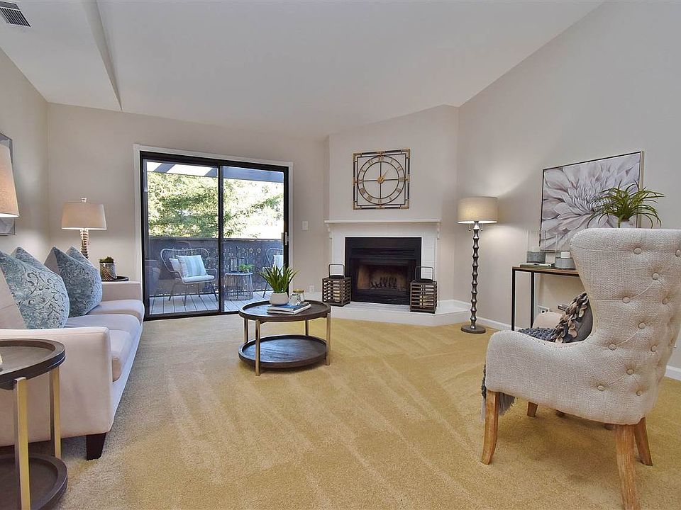 MOVE IN READY! This meticulously maintained home with open floor plan offers a beautiful remodeled kitchen with granite countertops, updated appliances and refrigerator; living room boasts vaulted ceilings and a cozy fireplace; recent upgrades include crisp clean painting and upgraded flooring; Convenient indoor laundry with full size washer/dryer; two enhanced bathrooms (one with tub/shower combo and the other with walk-in tile shower) primary bedroom suite has dual closets with mirrored doors; balcony with extra storage closet ~ all on one level enjoying privacy and views of the lovely grounds and mature redwood trees ~ PLUS 2-CAR spacious garage! Fabulous location near shopping, trails and parks, with easy access to Hwy 4/680