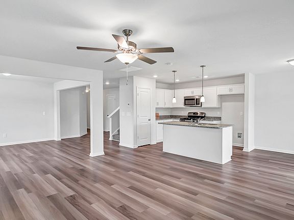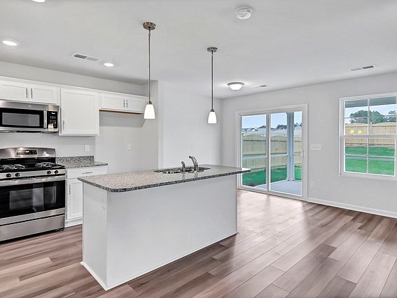 The Kershaw is a charming two story home with three bedrooms, two-and-one-half bathrooms and sits on a corner lot! Come inside and see the openness and flow of the downstairs living spaces. A dining area that double as a potential home office space is located just off the family room. The kitchen opens up to family and eat-in areas. Smooth granite lined kitchen counter tops are accentuated by white cabinetry for a coastal and bright design and feel. Hardwood-style luxury vinyl plank flooring lines all the downstairs common areas and powder room. Step upstairs to the primary bedroom which features a separate tub and shower, dual vanities and a roomy walk-in-closet. Both secondary bedrooms are spacious and all feature walk-in-closets. Outside features include a covered porch, extra patio, and fully fenced yard!