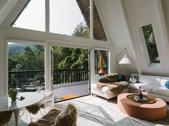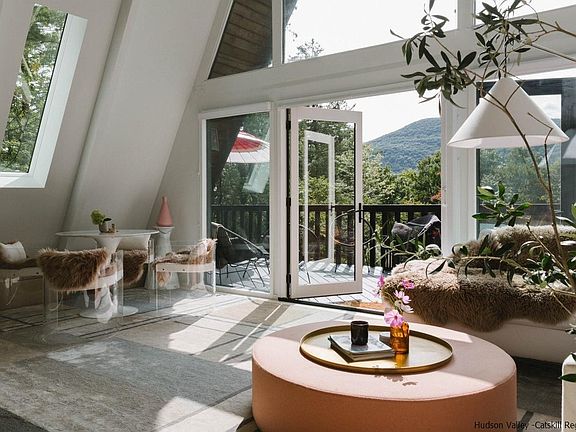 Sublime Designer A-Frame nestled amongst Grand Pines with Majestic Mt views. Take one 1966 basic oversized A frame, add one gifted Interior Designer, a ton of elbow grease, loads of updates and high-end finishes, careful editing of the lush grounds and lots of hours of designing and you come up with this unbelievable statement of A frame living at its best. Featured in a full spread in Magnolia Magazine along with PAST record breaking 6 figures income from Airbnb (please refer to new Town of Shandaken STR laws) this is one of the premier properties in our area. 3 BRs, 2 full baths (one with a large soaking tub) 2 full fireplaces, wet bar, on demand hot water, splits, new roof, updated electric, wrap around decking, baby barn, hot tub, fire pit, extensive plantings, and blue stone and outdoor lighting. Exterior shed. The A frame is all glass and light filled. Lucite railings, Juliet balconies off two bedrooms. Views galore and privacy abounds on this 4.8-acre lot. Close to Woodstock, Phoenicia, skiing, hiking, rail trail, Ashokan Reservoir, NYC bus route, all services, etc.